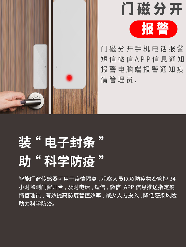 应用:本产品适用于居家防疫隔离,门窗开关防盗等场景。